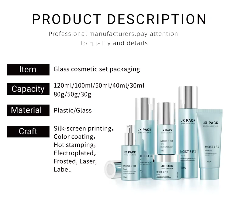 Skincare Brand Capacity: Bottle:30ml, 40ml, 50ml, 100ml, 120ml/custom Jar: 30g, 50g, 80g/custom Color: Purple/pink/blue/green/black/white/